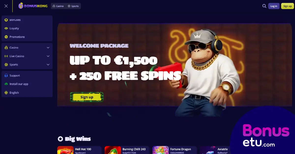 Bonuskong Casino on vuonna 2025 julkaistu uusi nettikasino, joka tarjoaa myös vedonlyöntiä. Kasinoa operoi Rocket Play B.V. ja sillä on Curacaon pelilisenssi. Bonuskong Casinolla on useita maksutapoja ja yli 6 000 kasinopelin valikoima. Uudet pelaajat voivat lunastaa jopa 1 500 € tervetuliaisbonuksen sekä yhteensä 250 ilmaiskierrosta. Asiantuntijamme Eero Ahonen tutustui tarkemmin kasinon pelivalikoimaan, bonuksiin ja asiakaspalveluun sekä testasi myös kasinon talletus- ja kotiutuskäytäntöjä.