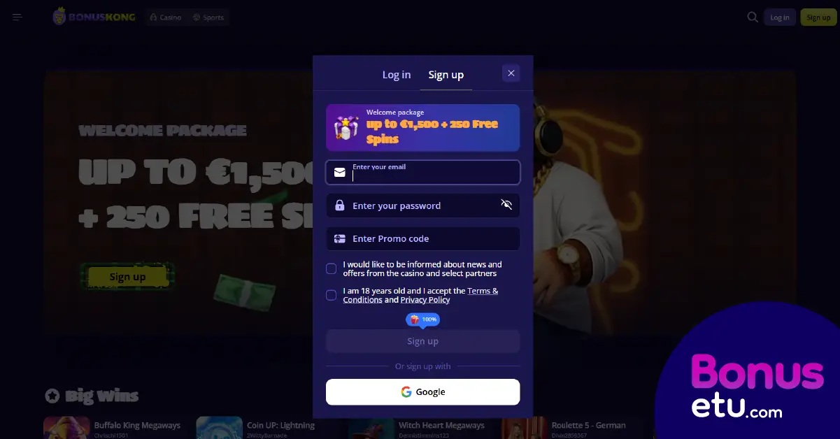 Bonuskong Casinolla pelitilin voi avata heti kasinon etusivulla klikkaamalla Sign up -painiketta. Tämän jälkeen rekisteröitymislomakkeeseen tulee täyttää sähköpostiosoite ja salasana, sekä hyväksyä kasinon ehdot ja tietosuojakäytäntö. Rekisteröityminen oli helppo tehdä ja aikaa pelitilin avaamiseen Eerolla meni lopulta vain muutama minuutti.