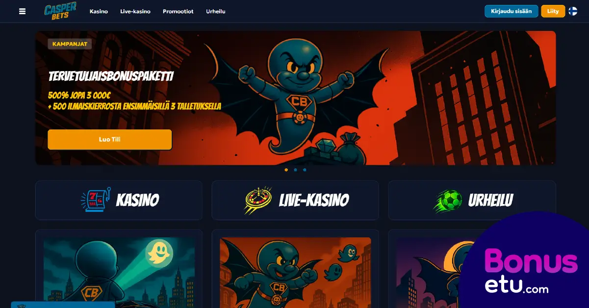 Casper Bets on vuoden 2026 alussa julkaistu nettikasino, jota operoi Equinox Holding N.V. Casper Bets on perinteinen nettikasino, joka vaatii rekisteröitymisen ennen pelaamista. Tarjolla on yli 10 000 peliä ja urheiluvedonlyöntiä, sekä runsaasti erilaisia bonuksia ja kampanjoita, kuten hauska bonuskartta. Lisäksi talletuksia voi tehdä useilla eri maksutavoilla. Bonusedun asiantuntija Tommi Korhonen otti Kasper Bets kasinon testiin ja tässä arvostelussa kerromme Tommin kokemuksia kasinon pelivalikoimasta, rahansiirroista, bonuksista ja muista ominaisuukista.