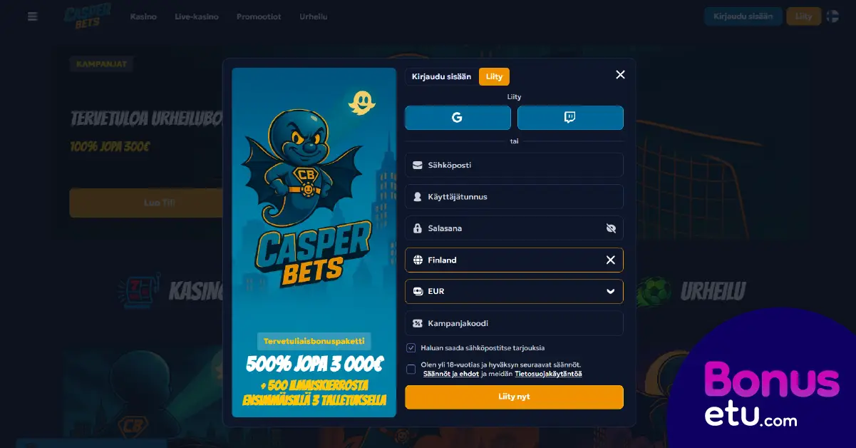 Casper Bets Casperbets.net kirjautuminen ja pelitilin avaaminen tapahtuu kasinon etusivulta klikkaamalla Liity-painiketta. Tämän jälkeen pääset täyttämään rekisteröintilomakkeeseen sähköpostiosoitteen ja salasanan sekä muut vaaditut tiedot. Tommin kokemuksen mukaan rekisteröityminen oli tehty helpoksi ja kesti vain muutamia minuutteja.