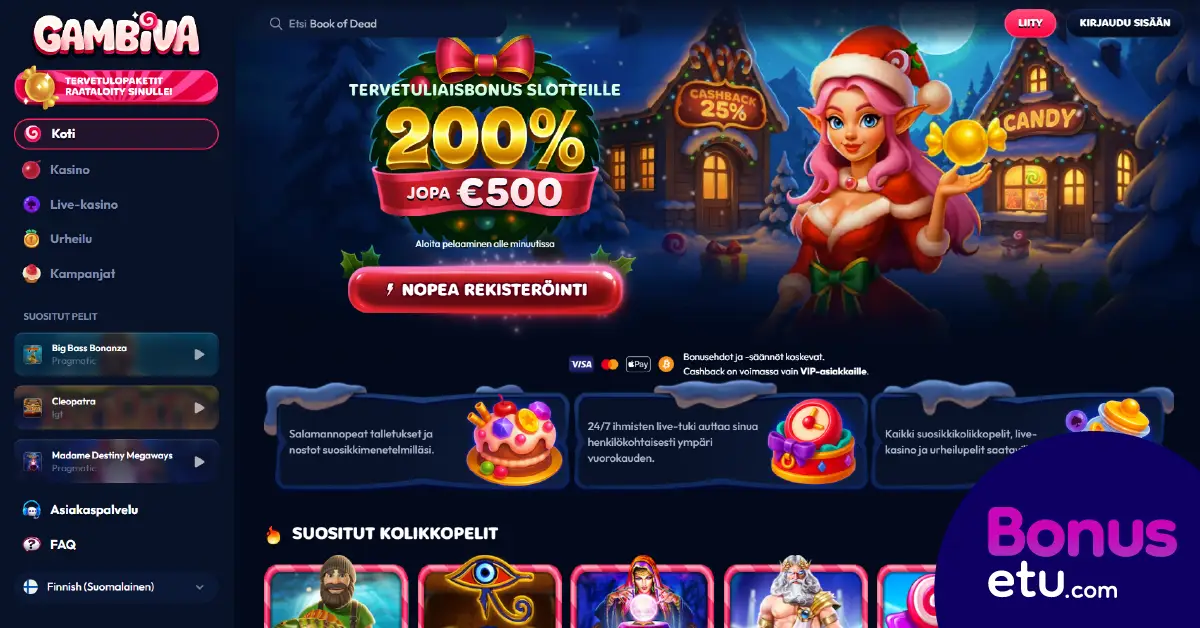 Gambiva Casino on vuonna 2025 julkaistu uusi nettikasino, jota operoi Softon Ltd. Gambiva tarjoaa yli 3 000 kasinopeliä sekä vedonlyöntiä. Maksutapoja kasinolla on useita, mukaan lukien kryptovaluutat. Bonusedun tiimin Eero Ahonen tutustui Gambivan pelivalikoimaan ja bonuksiin sekä testasi talletusta ja kotiutusta. Tässä arvostelussa kerromme Bonusedun kokemuksia Gambiva casinolla ja perehdymme myös kasinon sääntöihin sekä arvioimme asiakaspalvelun toimivuutta. Lue koko Gambiva casino arvostelu alapuolelta.