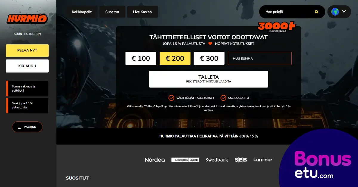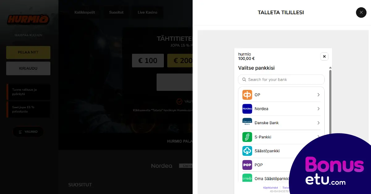 Hurmio.com sivustolla kirjautuminen ja pelitilin avaaminen tapahtuu automaattisesti ensimmäisen talletuksen yhteydessä, eikä perinteistä rekisteröitymiskaavaketta tarvitse täyttää. Pelaamisen voi aloittaa nopeasti heti kasinon etusivulla tekemällä talletuksen verkkopankkitunnuksilla.