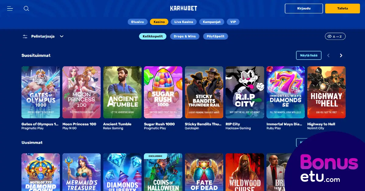 Karhubet Casino on lisännyt kattavaan pelivalikoimaansa noin 5 000 kasinopeliä. Kolikko-, pöytä- ja livekasinopelien lisäksi kirjastossa on Välittömät voitot -kategoria, johon sisältyy muun muassa crash-pelejä, plinkoja ja noppapelejä.