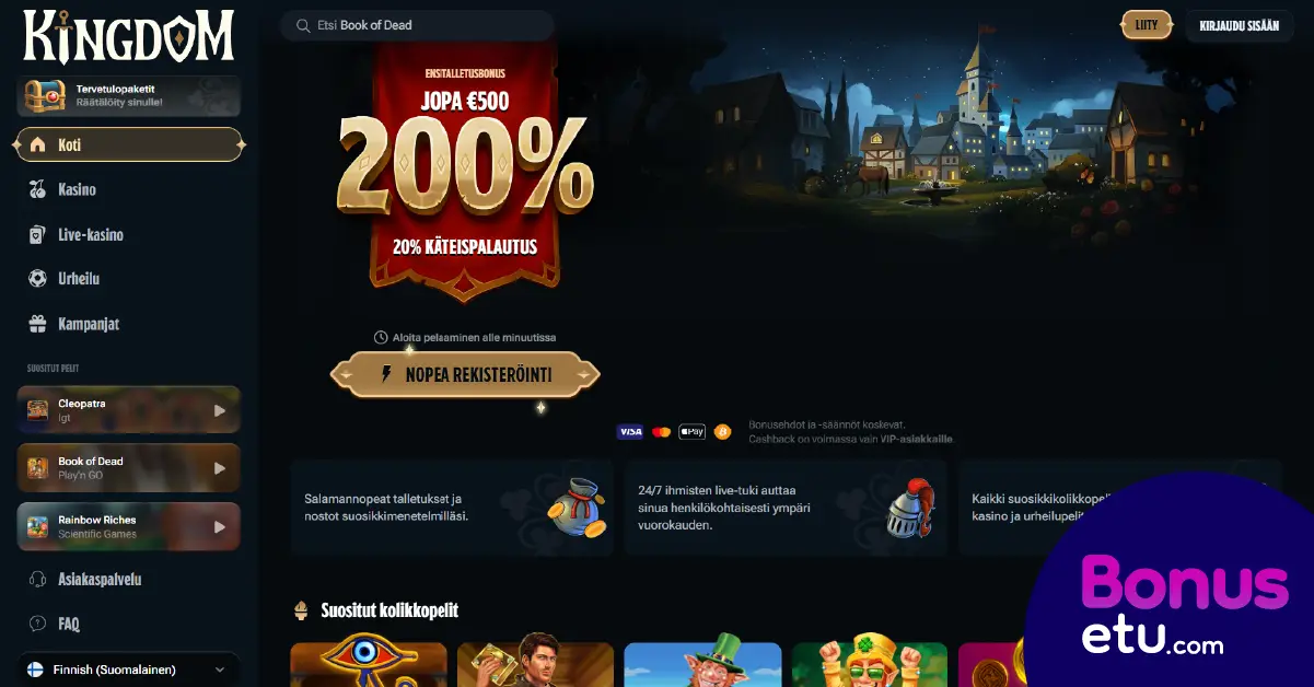 Kingdom Casino on kryptomaksuja tukeva sivusto, jonka Bonusedun perustaja Kimmo Koo laittoi testiin kolmella pikkutalletuksella (Visa-talletus). Kasinon vetonaula on 200% ensitalletusbonus ja kolme muuta talletusbonusta yhteensä 9 000 euron arvosta. Kingdom Casino ei tarjoa voittoja verovapaasti Suomessa asuville pelaajille.