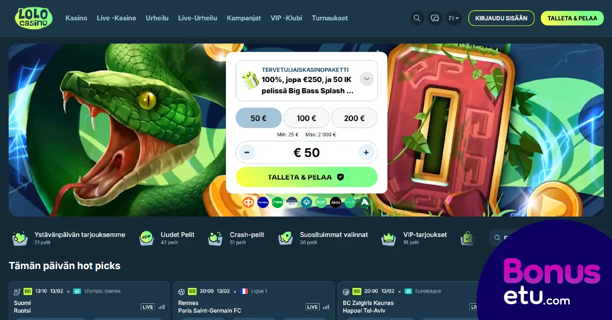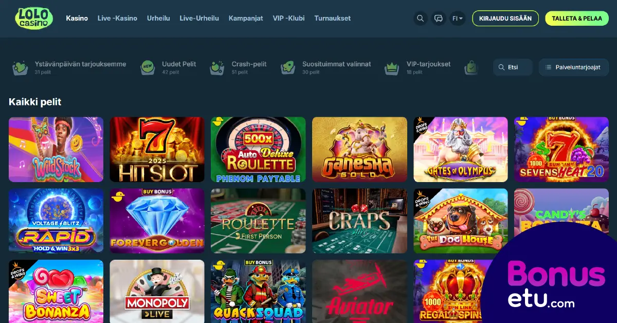 Bonusedun Tommi Korhonen tutustui Lolo casinoon ja testasi kasinon pelejä, talletus- ja kotiutusprosessia, asiakaspalvelua ja tutustui muihin ominaisuuksiin. Lue lisää Bonusedun Lolo Casino kokemuksia alapuolelta.