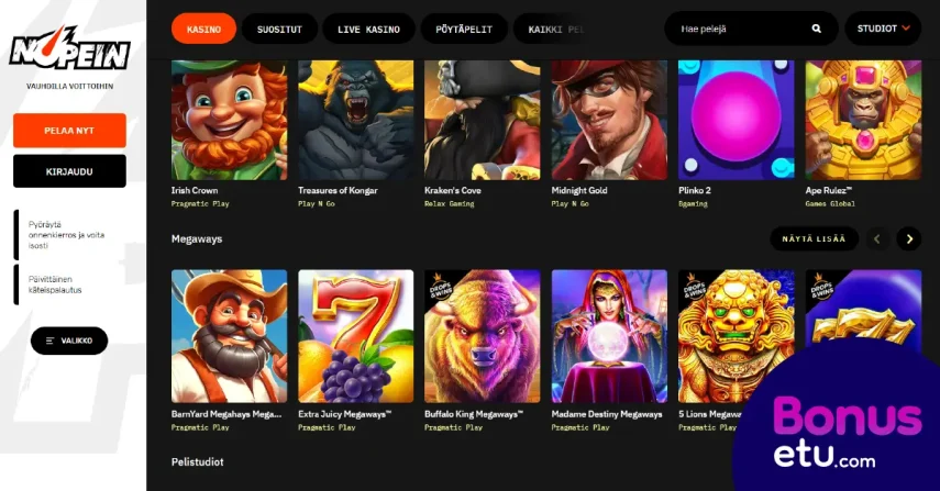 Nopein Casinon kiiteltävästä pelivalikoimasta vastaa koko joukko markkinoiden tunnetuimpia pelintarjoajia, kuten Evolution, Play’n GO, Pragmatic Play ja NetEnt.