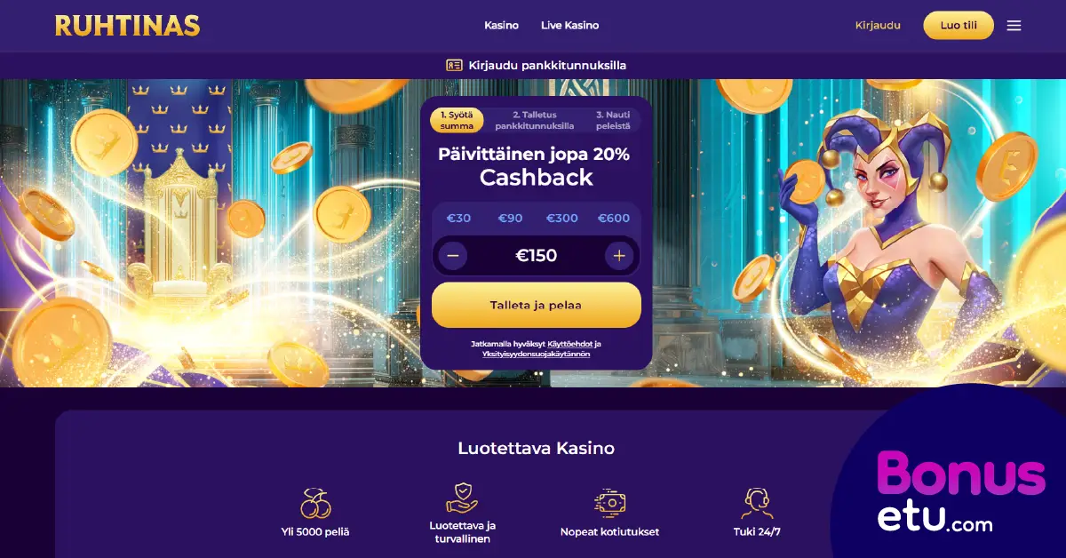 Et tarvitse bonuskoodia hyödyntääksesi cashbackin. Siirry Ruhtinas Casinolle meidän linkin kautta, niin tulet saamaan varmasti kaikki mahdolliset edut, mikäli sellaisia vain on tarjolla.