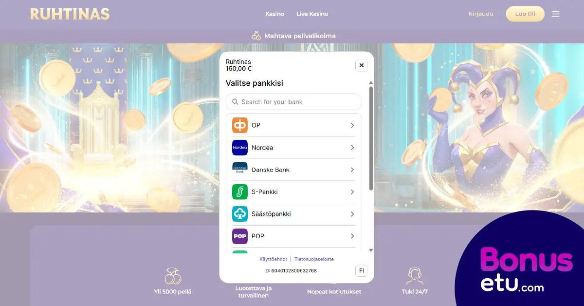 Kirjautuminen Ruhtinas.comiin ei vaadi aina uutta talletusta. Klikkaa “Kirjaudu”, valitse “Kirjaudu sisään” ja tunnistaudu pankkitunnuksilla. Suosittelemme tekemään tämän aina ennen tallettamista, koska pelitilillä voi odottaa eksklusiivisia latausbonuksia.