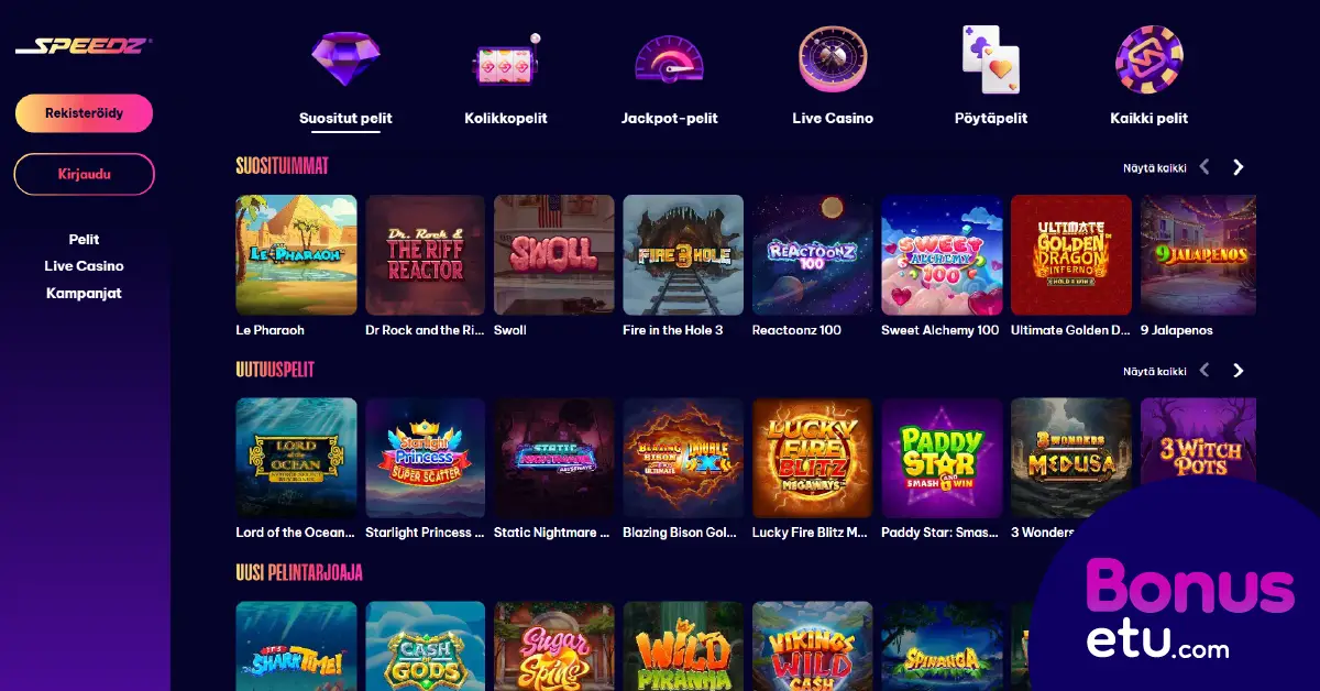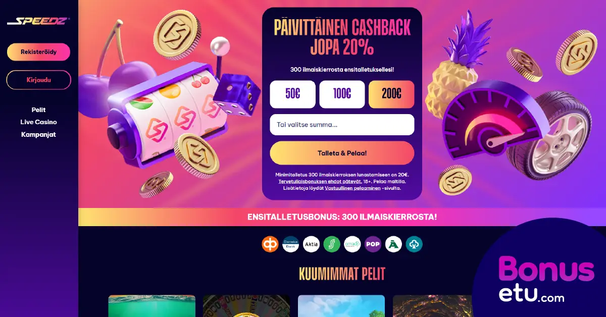 Speedz Kasino on Bonusetu tiimimme mielestä mielenkiintoinen uusi lisäys kasinovalikoimaan. Kasinon vetonauloina toimivat Trumon verkkopankkimaksut sekä laadukas pelikattaus, johon on lisätty myös isoimmat jackpot-pelit.