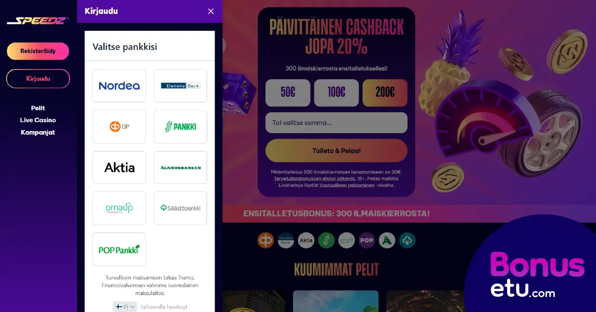 Speedz Casinolla niin pelitilin avaaminen kuin sisäänkirjautumiset tapahtuvat helposti verkkopankkitunnuksilla.