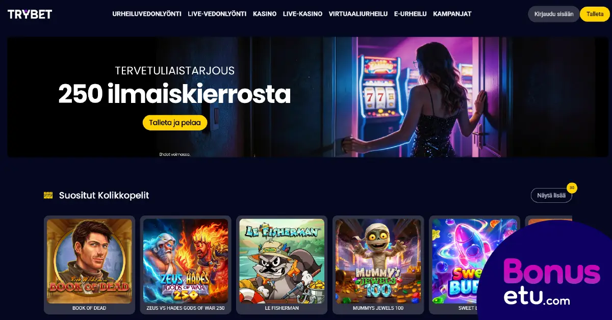 Bonusetu suosittelee Trybet.comin testaamista vähintäänkin tervetuliaisbonuksella. Saat meidän kauttamme normaalia paremman tarjouksen – 250 ilmaiskierrosta muuttuu 300 käteiskierrokseksi, talletusvaatimus pysyy samana.