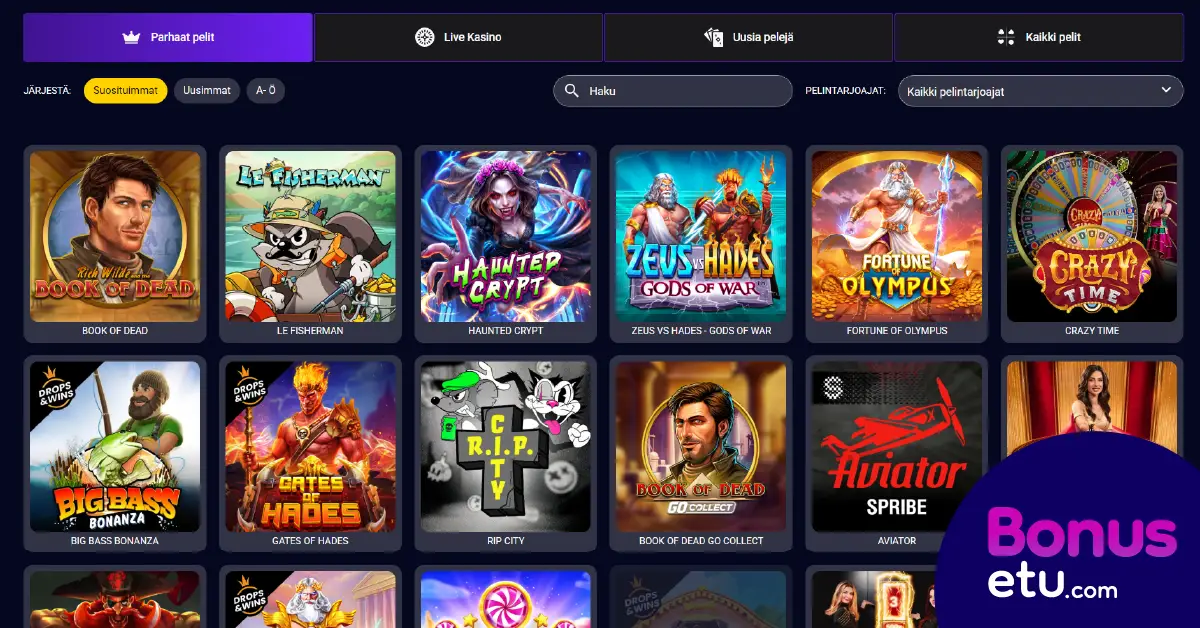 Pelivalikoima kattaa arvioni mukaan 3 000 slottia ja 400–500 muuta peliä. Löysin kaikki omat suosikkini, kuten Hacksaw Gamingin uutuudet, Nolimit Cityn ostobonuspelit sekä Play’n GOn valmistamat klassikot aina Reactoonzia myöten.