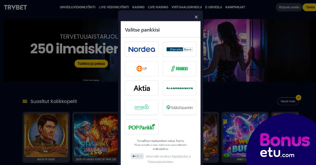Talleta Trybet-kasinolle vahvasti tunnistautuneena verkkopankista. Talletin itse 30 euroa, mutta saat uuden pelaajan edun 20 eurolla. Suomalaisista nettipankeista löytyvät kaikki suurimmat nimet, kuten Osuuspankki, S-Pankki, Säästöpankki ja Nordea.