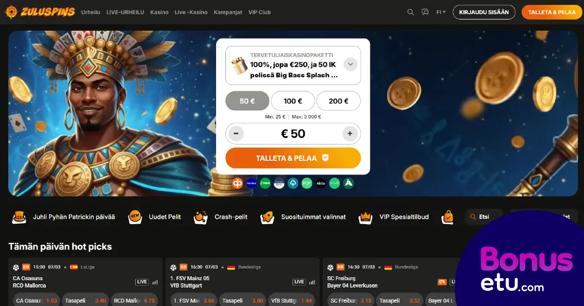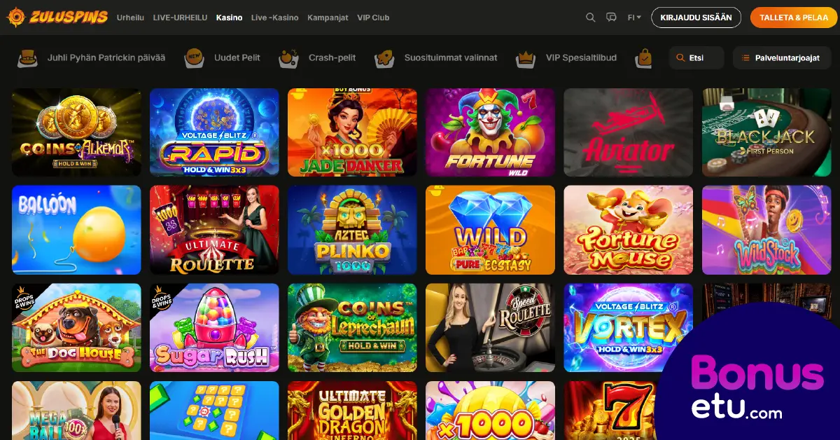 Katso Bonusedun netticasinot listaus löytääksesi ehdoiltaan suopeampia pelisivustoja tai laita Zuluspins Casino testiin 1 500 euron tervetuliaistarjouksen siivittämänä.