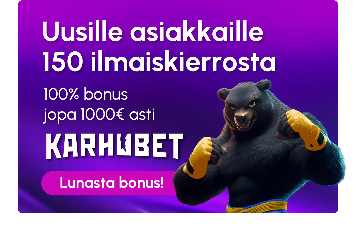 Karhubet on vastikään ovensa avannut pikakasino suomalaisille pelaajille. Tämä supersuositun 21.comin raunioille rakennettu MGA-kasino on lyhyessä ajassa saavuttanut vankan pelaajakunnan niin ilmaiskierrosten kuin nopeiden kotiutustensa ansiosta.